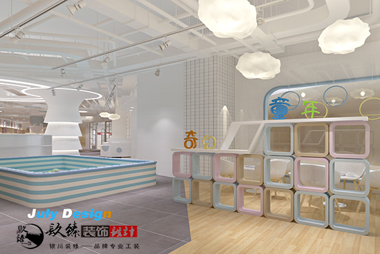在本套方案中,分為了產品展示區(qū),娛樂區(qū),收銀區(qū),還有一個大的區(qū)域,就是銀川母嬰店裝修設計|銀川裝修網嬰兒游泳區(qū),這里用玻璃作為隔斷,很清楚的讓外面等候的家長們看到了里面寶寶游泳的場景,滿是溫馨的畫面。