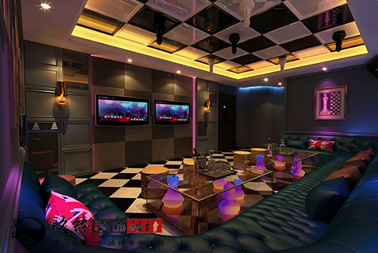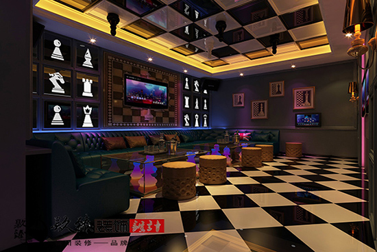 銀川裝飾公司镹臻裝飾的設計師為了達到場所的要求,大量使用暗色系的搭配,大包間頂面利用國際象棋為元素進行吊頂?shù)难b飾,恰好和地面黑白格子的地磚相互搭配,更具對稱感,另外墻面也是用國際象棋的棋子作為點綴,國際象棋的形象非常的有個性,國王,騎兵等等的造型簡單而生動。