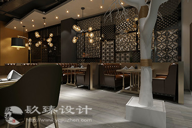 本案整體以中式復(fù)古風(fēng)格為主,銀川裝飾公司銀川裝修公司镹臻設(shè)計(jì)設(shè)計(jì)師主要利用線性平面來劃分室內(nèi)空間的功能與布局。開間方向流動(dòng)相的座椅和餐桌,與流動(dòng)型的鏤空隔斷形成了一個(gè)整體,造型增強(qiáng)了空間的親密氛圍。該風(fēng)格不但能夠搭配著迷幻的色彩,還能促使人沉迷于餐廳之中。尤其在餐廳大堂,做舊古木色的餐桌餐椅,一排排的餐桌整潔亮麗,餐桌上的餐具擺放也是很有講究,整個(gè)內(nèi)飾都充斥著圓滑和時(shí)尚的現(xiàn)代風(fēng)味。餐廳遠(yuǎn)景圖,遠(yuǎn)遠(yuǎn)望去像是一副古典的畫,色彩的搭配和細(xì)節(jié)的設(shè)計(jì)恰到好處。