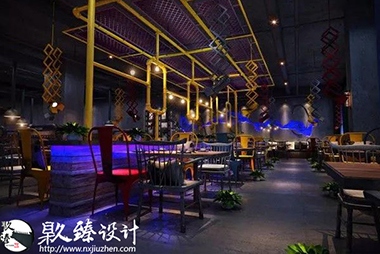 燒烤店其中的一角文化墻上的海苔是這片空間為數(shù)不多的綠植,為工業(yè)風格的燒烤店帶來一抹綠意,小清新躍入眼簾,很好的緩解了視覺疲勞。清水混凝土墻與鋼的巧妙配合,鐵管與暖色燈光的色彩互動,削減了鋼鐵冷視覺,柔和了空間美。原木的置物架上擺放著主人心愛的藏品,或許是幾個空酒瓶,或許是一卷麻布,又或者是一對仿真羚羊角,全憑主人心情與愛好,也許別人并不覺得有多么珍貴,但是在主人眼里他卻是無價之寶。將工業(yè)風格與燒烤店完美的結(jié)合起來,鋼鐵空間中也不乏柔情,設計的韻味就體現(xiàn)在此處。