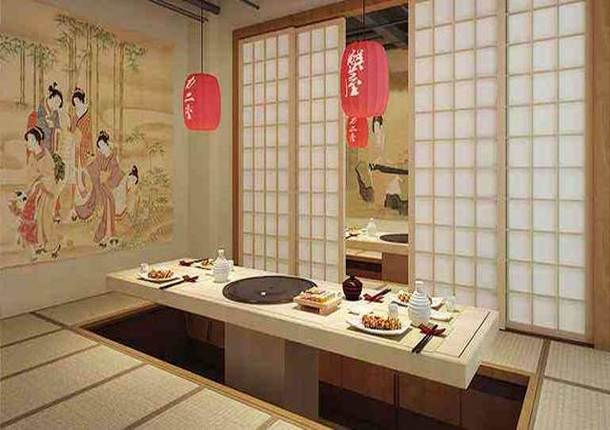 日式包間的重要特征是視點低,選用的軟裝家具都偏矮,進(jìn)門塌塌米,傳統(tǒng)包間應(yīng)當(dāng)席地而坐,也有很多料理店的包間為照顧國內(nèi)食客們的習(xí)慣而改用餐椅餐桌。日式包間是一處獨立僻靜的和室,它更應(yīng)當(dāng)注重氛圍的營造,努力營造幽靜隱秘的禪意。