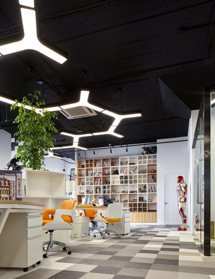 通往主要辦公區(qū)域和接待區(qū)的大面積墻面柜,采用小方格柜逐個拼接組合,馬賽克以具體直觀的形式,成為空間中最醒目的點綴。大量精美的手辦整齊地放置其中,與格柜組合一起,猶如放大的像素方塊將縮略的影像畫面囊括起來,形成循環(huán)往復的動態(tài)錯覺。
