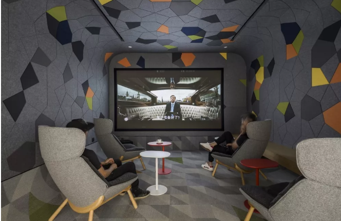 設(shè)計(jì)師將銀川辦公室設(shè)計(jì)主題定為“游樂場”,把活動(dòng)空間分為三部分,展示了大多數(shù)人的成長歷程。首先以兒時(shí)玩的萬花筒為主題的VIP影院,希望從影院中看到懵懵懂懂的童年時(shí)光。