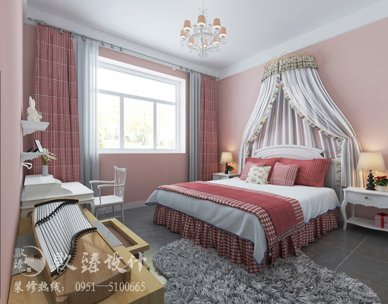 銀川裝飾裝修|镹臻裝飾|家裝裝修兒童房的設(shè)計中,因考慮到業(yè)主家是女孩,所以專門設(shè)計了一款女孩房,女孩子,當(dāng)然少不了粉色,所以墻面主題顏色運用了比較清新的淡粉色,窗簾的軟裝配飾上也使用粉色方格來對稱。你們還喜歡嗎?