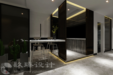 墻壁上的赫本或是工作室內(nèi)的一抹春風(fēng),案幾靠幾根細(xì)細(xì)的桌腿支撐,頗有潑墨揮毫之雄壯,這簡單的造型包含著善意和平和。室內(nèi)一角小小吧臺可在閑暇之余略飲薄酒,疏影疊山,且飲且談。設(shè)計師用現(xiàn)代設(shè)計手法解釋了傳統(tǒng),使環(huán)境和心靈都達(dá)到靈與靜的唯美境界。