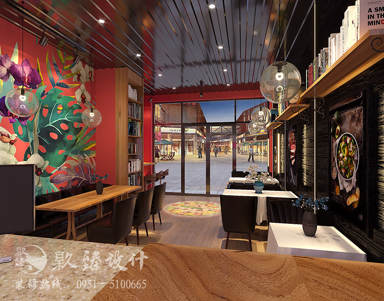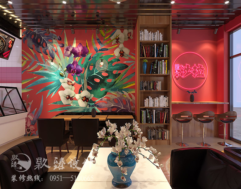 的成分在里面,大概是銀川裝修公司|镹臻設計|甜品店裝修設計|設計師想讓來這里就餐的顧客們在這種浪漫,多彩的環(huán)境下會更加開心吧。你們看到墻面的彩繪造型了嗎?這也是本案例中很大的亮點,藝術與色彩的碰撞摩擦出了不一樣的火花,恰好中間設計了書架隔斷,又分化出另一個區(qū)域,加上了店鋪logo,不會顯得那么雜亂無章,也許這樣的設計,就是華而不亂的體現吧。