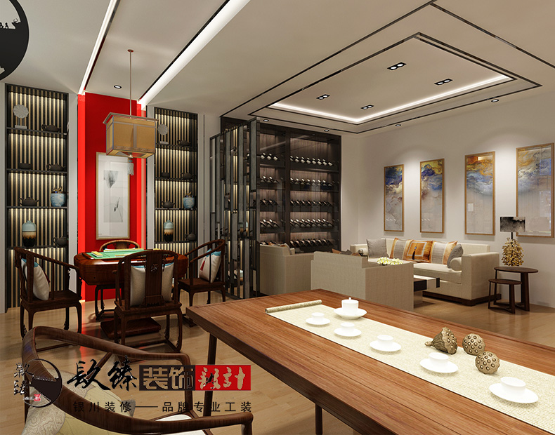 整個(gè)空間分為展示廳,休閑廳,辦公廳,每一個(gè)空間的主題色都有所不一。風(fēng)格為新中式風(fēng),銀川裝修公司|镹臻裝飾|店鋪裝修新中式風(fēng)格的設(shè)計(jì)中我們經(jīng)常能看到的是木質(zhì)線條吊頂,中式風(fēng)格的造型吊燈。
