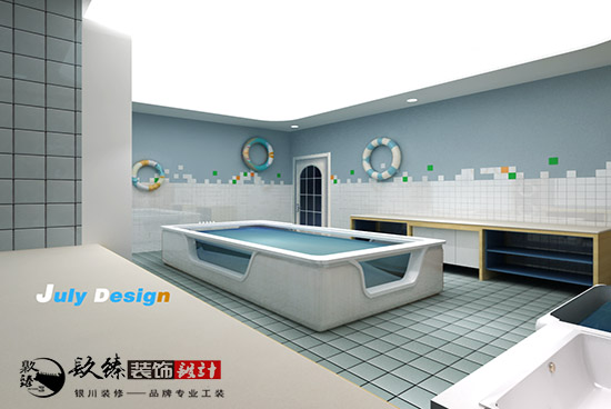 在本套方案中,分為了產品展示區(qū),娛樂區(qū),收銀區(qū),還有一個大的區(qū)域,就是銀川母嬰店裝修設計|銀川裝修網嬰兒游泳區(qū),這里用玻璃作為隔斷,很清楚的讓外面等候的家長們看到了里面寶寶游泳的場景,滿是溫馨的畫面。