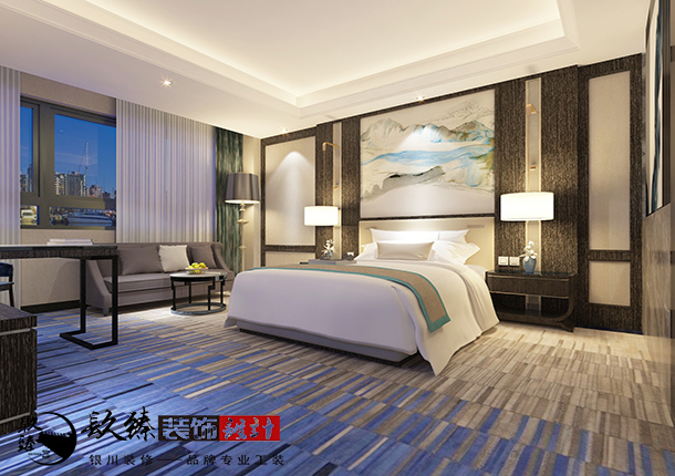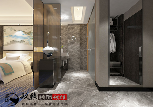 該酒店展現(xiàn)設(shè)計的大床房給人一種當(dāng)代藝術(shù)感,墻面以及床頭的掛飾猶如一幅水墨畫,飄飄而來,輕輕而去。除了具有文藝氣息的裝飾畫以外,最具有現(xiàn)代感就屬地面的地毯和進(jìn)門的衣帽柜了,設(shè)計師利用金屬與木頭兩種不同的材質(zhì)搭配展現(xiàn)出現(xiàn)代的時尚感,一間平米不大的大床房間瞬間被銀川裝修公司銀川酒店裝修設(shè)計刻畫的高大尚了起來。