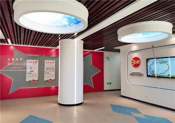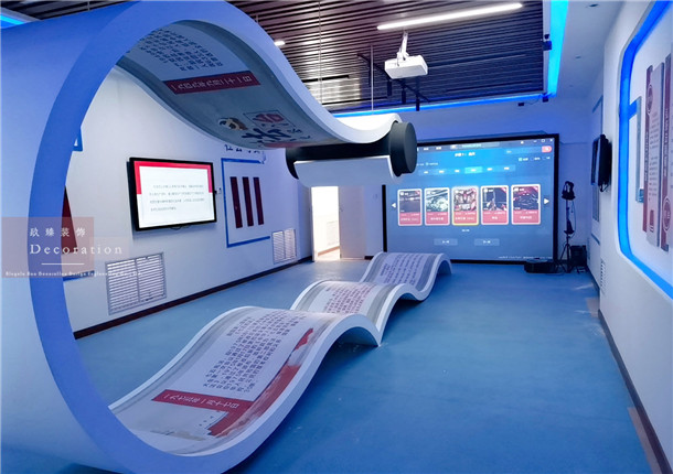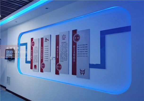 首先學(xué)校走廊宣傳欄里寫有社會主義核心價值觀的宣傳文字,培養(yǎng)學(xué)生們的精神文明是非常有必要的。消防與法治教育是兒童教育中非常重要的部分之一,所以廣告欄內(nèi)也將這兩點納入其中以展廳類的形式描繪出一種簡潔的展現(xiàn)。 在展廳內(nèi)部最大的亮點是波浪造型的設(shè)計,在施工的時候是镹臻裝飾的工程總監(jiān)帶領(lǐng)專業(yè)技術(shù)工人對照施工圖細心所搭建而成,也是為了將效果更好的呈現(xiàn)。