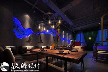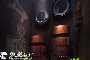 燒烤店其中的一角文化墻上的海苔是這片空間為數(shù)不多的綠植,為工業(yè)風格的燒烤店帶來一抹綠意,小清新躍入眼簾,很好的緩解了視覺疲勞。清水混凝土墻與鋼的巧妙配合,鐵管與暖色燈光的色彩互動,削減了鋼鐵冷視覺,柔和了空間美。原木的置物架上擺放著主人心愛的藏品,或許是幾個空酒瓶,或許是一卷麻布,又或者是一對仿真羚羊角,全憑主人心情與愛好,也許別人并不覺得有多么珍貴,但是在主人眼里他卻是無價之寶。將工業(yè)風格與燒烤店完美的結(jié)合起來,鋼鐵空間中也不乏柔情,設計的韻味就體現(xiàn)在此處。