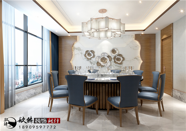 低調(diào)的淺灰色背景墻在歐式簡(jiǎn)約吊頂?shù)难b飾下,帶著淡淡的藝術(shù)氣息,背景墻上的花朵裝飾鏡摒棄了中式風(fēng)格的復(fù)雜雕刻,輕裝上陣,展現(xiàn)出少有的質(zhì)感,金光燦燦的燈光點(diǎn)亮了中餐廳設(shè)計(jì)的高潮,繡花的餐椅展現(xiàn)了中餐廳設(shè)計(jì)的柔美風(fēng)情。