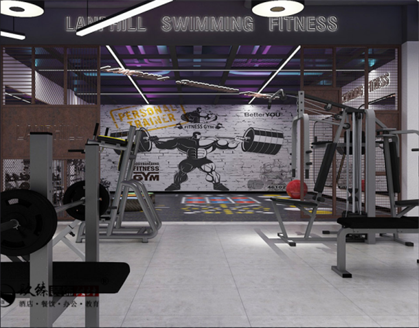 以黑色、黃色為主色調(diào),利用鐵藝打造工業(yè)風(fēng)格,本設(shè)計(jì)的一大亮點(diǎn)就是前臺(tái)側(cè)面的啞鈴雕塑。前臺(tái)、雕塑、接待區(qū)均采用鐵板制成。鐵藝的運(yùn)用打造濃濃工業(yè)風(fēng)。